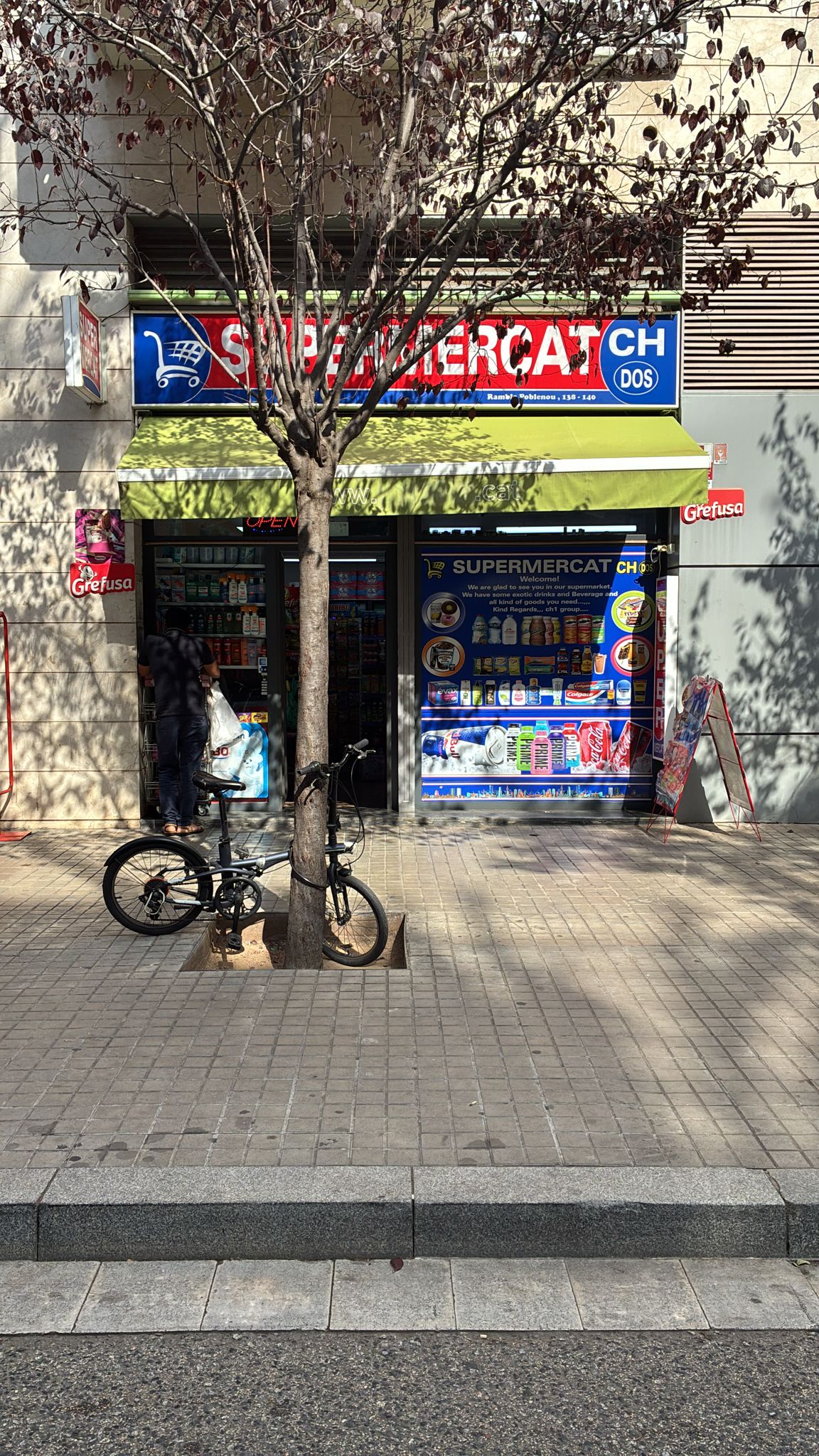 Gemma dice: Este es un plomo, un plomo de aquí y de allá, porque el Rétul supermercado está en Catalan, pero el texto de bienvenido está en inglés.